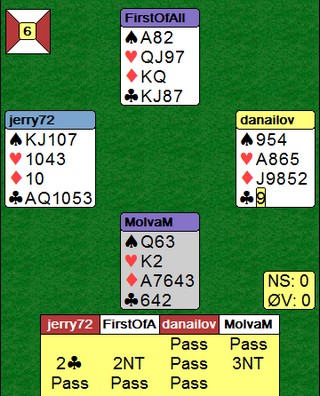 Øst startet med kløver 9 som vest lot nord vinne med knekten. Han tok for KD i ruter (vest kasta en hjerter) og spilte hjerter til kongen. Spillefører måtte la ruteresset ligge selv om bordet var uten opplagt inntak og fortsatte med hjerter til dame og ess.