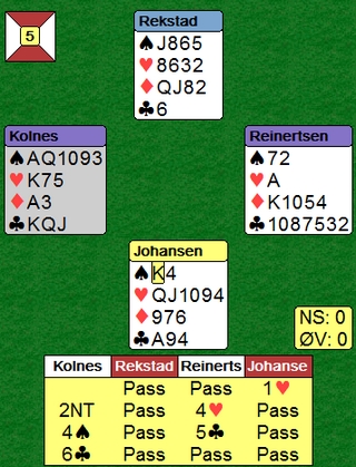 Ronny følte han hadde gode kort for sin naturlige innmelding og løfta til slem Spar konge i utspill var ikke akkurat det verste. Martin stakk, la ned kløverkongen som han fikk for, hjerter til esset, ruter til esset, hjerter konge for å kaste en ruter, ruter til kongen og ruter til stjeling. Kløverdame og claim.