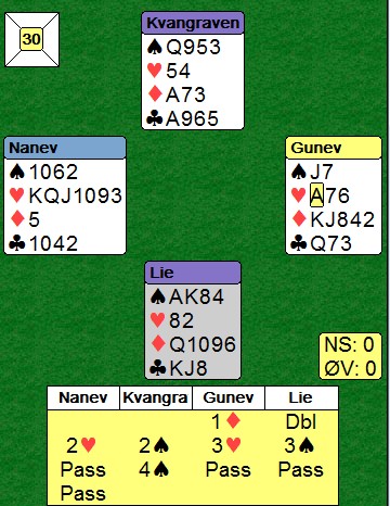 Nils spiller ut hjerter og prøver å treffe makkers farge. Det gjør han forsåvidt, men når Terje legger styrke går 3NT hjem. Han må stikke og skifte kløver.