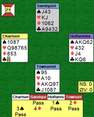 DeButton var også i 4sp, dog etter et litt annerledes meldingsforløp. Syd vrengte kløverkappen ved å spille knekten fra hånda. Hadde damen og tieren bytta plass, ville det vært et spill for galleriet. Nå ble det 10 IMP ut. |