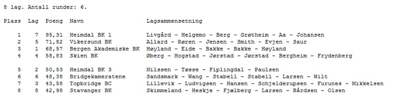 Andre halvrunde starter forsiktig med mange flate spill. I spill 18 levere Allan og Terje et flott motspill mot 3NT og beiter der det blir elleve stikk på det andre bordet. Kampen mellom Heimdal og Vikersund ebber ut uten de store spillene og ender 13.82 - 6.18 til trønderne. BAK ligger på andreplass og de vant nøyaktig med samme sifre.