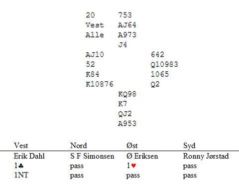 Erik Berg starta med spar ess og skifta til kløver. Esset vant stikk og så seilte ruter 9 rundt (!). Nord hadde vist blakk i ruter med sin 4ru, så det var sikkert ikke noe kunststykke for stjørdalingen. Kløver til stjelling og kongen kom på. Spar til røff og ruter til damen. Så alle ruterne untatt den siste. Posisjonen er over.