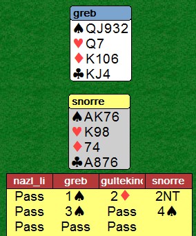 Øyvind Saur fikk sparkongen ut til esset. Han fortsatte med ruter til bordet og kløver til kongen (!). Han tenkte sikkert slik at hvis en var kort i kløver, var det sikkert syd som hoppet til 3sp. Nå kunne ikke 3NT vinnes lenger. På det andre bordet la Glenn Grøtheim ned kløveresset tidlig og da spilte resten seg selv. D10xx kunne fanges opp og en hjerter forsvant på ruteren. Hjerteresset satt foran kongen og +920. Den scoren tror jeg ikke mange slår.