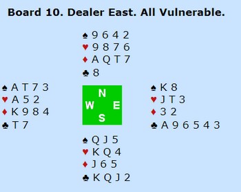 Når det ikke satt kunne Nord stikke knekten og sette opp hjerterfargen. Når sparen nå ikke satt rakk ikke Espen og sette opp et kløverstikk, og måtte derfor gå bet. På det andre bordet spilte spillefører på kløver og hadde ingen problemer med å vinne kontrakten med den fine kløversitsen.