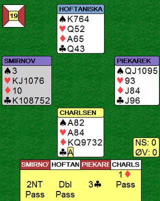 Østerrikeren i Øst trodde 2NT viste de to laveste umeldte fargene og hoppet til 4 hjerter over 2NT. Nå hadde dessverre Vest så mye minor at det ikke var aktuelt og stå med og de kom i en spillbar kontrakt. Husk at det brukes skjermer, så makker får ikke med seg alerteringer og forklaringer. Med feks 2155 ville Vest passet på 4 hjerter. Hoftaniska og Charlsen ropte på turneringsleder etter spillet, men uten at jeg kan se at de på noen måte kan få medhold i noe. Østerrikerne brant jo slemmen!