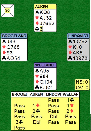 * Og der viser det seg at noe ureglementert har skjedd. Spillet er justert til 4 hjerter minus seks for Østerrike og Norge får 12 imp til! |