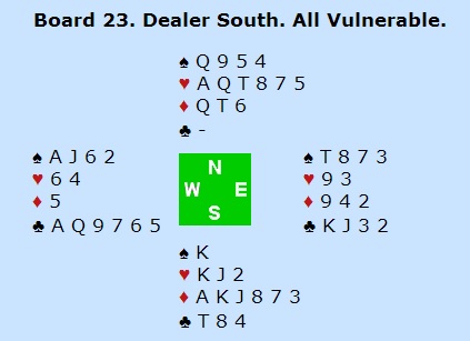 Etter Arves hopp til 3 spar som viste singel spar og tilpass til hjerter kunne Tor i Nord se at her var det supertilpass. Han kontrollmeldte 4 kløver før makker viste rutercue. Tor "visste" nå at Arve hadde AK i ruter og god hjertertilpass. Dermed var det sannsynligvis bare en spartaper, så for å gjøre det enkelt hoppet han bare til 6 hjerter. Den kontrakten var det ikke mulig å bete, og 13 imp i riktig kolonne da bulgarene stoppet i 5 hjerter på det andre bordet.