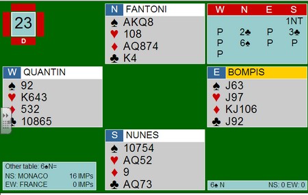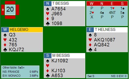Tor Helness i øst var tilsynelatende superflink ta han la liten på ruter 9. Bessis gikk opp på kongen og smilte en stund da har trodde han hadde lurt Tor. Teller du tapere på hånda, så har du tre i kløver og tre  i ruter, men bare tre trumfer igjen. Da ble det ei beit likevel.