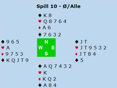 Thomas åpnet i 1 spar i Syd, og fikk 1NT fra makker. Nå meldte han 2NT som utgangskrav (noe hardt, men helt akseptabelt) og Thor-Erik viste frem 5+ hjerter med 3 ruter. Nå ville ikke Thomas vise frem den tynne sparfargen med 3 spar, så han meldte 3NT. Nå tok det helt av for Thor-Erik som trodde makker hadde en 5431-hånd (med singel hjerter, siden de melder 3 hjerter over 3 ruter med 2+ hjerter). Dersom 4 kortsfargen er i kløver håpet han det stod slem.