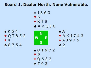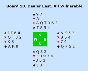 Bjerregård åpnet med 1 kløver og nå gjorde Helge det svært vanskelig for svenskene ved å melde to ruter. Morath i Øst doblet opplysende og Bjerregård meldte sin laveste majorfarge. To hjerter ble passet ut og to sonebet til de kjekke sørlendingene.