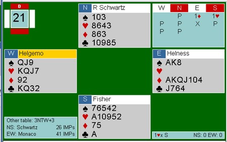 Tor Helness kunne ikke se for seg en hånd der Geir Helgemo ikke hadde en sparhonnør, så han gikk i Blackwood over 4hj. Et ess gjorde han ikke noe klokere, så han bare hoppa til 6ru. Spar ess og hjerterkonge ville vært nok til 7ru, mens den hånda Geir hadde kunne endt med beit. Ron Scwartz i nord spilte ut hjerter og da endte det kjapt med tretten stikk.