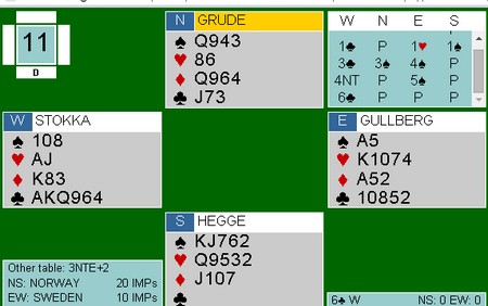 og Sverige vant 10 IMP mot Norge i denne slemmen siden Norge på det andre bordet stoppet i 3NT. En sving på 20 IMP for å finne hjerterdamen.