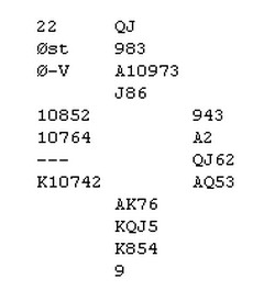 Jeg åpnet i første hånd med 1ru. Syd doblet opplysende. Jeg kan nesten ikke korsfeste luringen for hans pass og Nils Kvangraven i nord hadde flaks som vanlig når han passet. Det er sikkert rett av meg å prøve å finne en flukt, men erfaringen her er at det er ofte å løpe fra asken til ilden.