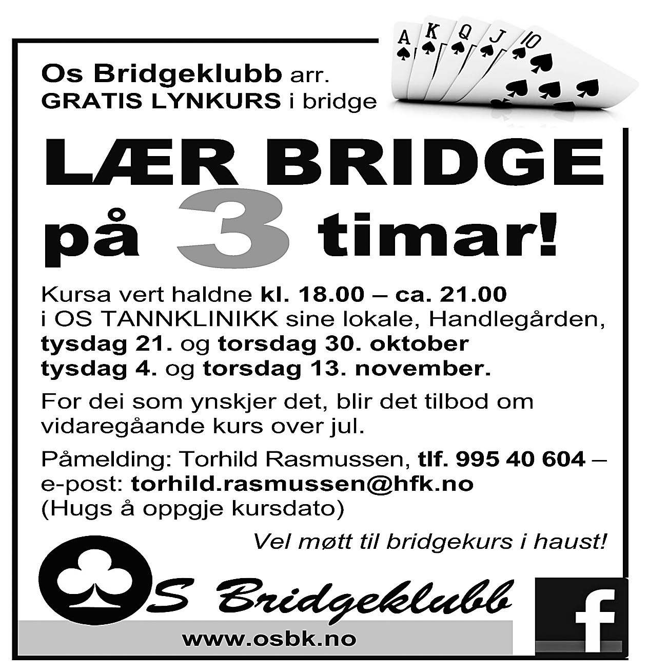 Neste torsdag er det høstferiespilling dvs enkveldsturnering samt at vi legger den inn som simultanturnering  og spiller mot hele bridgeriket. Så - vel møtt om en snau uke.