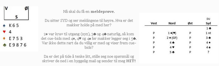 Det som fascinerer meg med slike spill er at det er nesten aldri noe fasitsvar i bridge. Espen Lindqvist, Ole Kopstad og Espen Erichsen er kategorisk på at 6kl spør etter tredjekontroll i kløver og at hjerter er trumf, mens andre, Boye blant annet, er like sikker på at i bridge skal vi bruke hue og at 6kl er forslag til kontrakt. Boye har flere på sitt lag, selv om noen av dem har et bein i hver leir.
