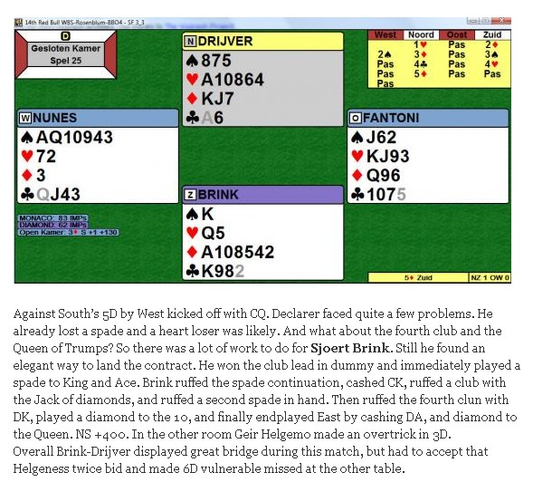 Jeg synes alltid det er underlig å spille mange spill som egentlig ikke betyr noen ting. Kvalifiseringen gikk over to dager med 100 spill tilsammen, men når Semfinalen startet spilte det ingen rolle om du hadde 60% eller 51% de de første sesjonene. Alt ble avgjort over femti spill i Semifinalen og der måtte de norske bli omtrent nr. 40 eller bedre. Litt surt kanskje for de som i sum på 150 spill har mer enn nok pluss, men hadde ikke den nødvendige glien på den siste tredjedelen. Dette er jo likt for alle, så kanskje er det greit?