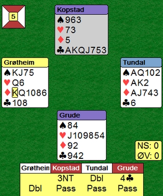 Her mot Egil Meyer (V)- Eivind Ruud (Ø) hadde Jan Martinsen i N sp J5- hj 62- ru A- kl AKDJ9632, men over 5 kløver som et par andre par fikk doblet med bare -500 ut meldte ØV videre til 5 hjerter som står for 650. -2!