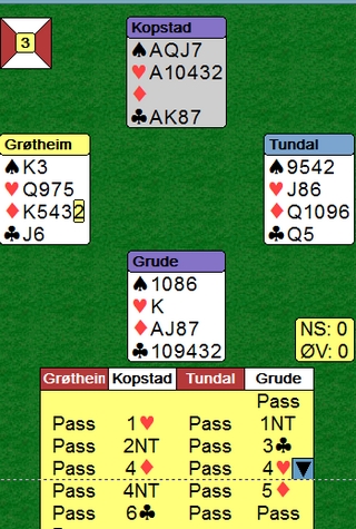 V åpner med pass, 1 hjerter fra N og Ø har egentlig ikke noen fornuftig melding å komme med selv om 13 HP er av åpning styrke. Pass også fra S, men nå vil mange i V «ballansere», doble (= 4 spar+ till til ellers) eller melde innpå 2kløver. N ga seg ikke, flere meldte 4 hjerter som ble doblet.
