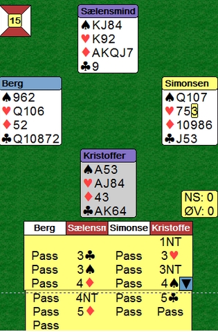 Dette er sluttpossen med fem kort igjen. Thomas blanka kløverkongen sin tidlig, men Silla leste han helt korrekt for 5-6-0-2 opprinnelig, inkludert kløverkongen. Derfor kløver til esset (!) og hjem med kontrakten. Det hadde ikke vært NOEN vits for syd å holde igjen en kløver til, for da hadde han garantert blitt innspilt på hjerteresset og måtte gitt bort de to siste i kløver.