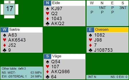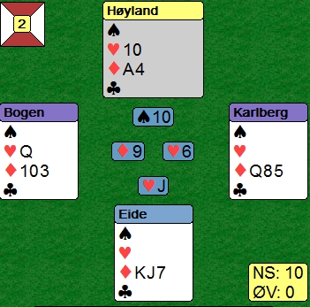 Jeg så flere vellykka Multi-åpninger i dag, men denne av Grøtheim - Tundal kosta 1100. Sikkert en "opplagt" dobling av Petter, men jeg synes nå det er fint å se på likevel. Mange ville meldt 2sp på øst sin hånd (pass med spar og meld 3hj/4hj hvis du ikke har). Da blir det verre å få tatt ØV, men det er mulig 2ru - 2sp betyr noe annet for ØV.