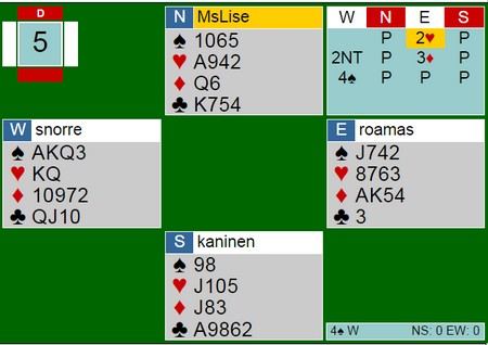 Lise Blågestad fant eneste utspill som ga meg problemer, spar,  men det burde gått greit likevel. Jeg stakk på hånda, ruter til esset og kløver mot. Håpet var at kaninen stakk opp med honnør i forhånda slik at jeg kunne presse ut den andre honnøren. Det skjedde ikke og Lise kom inn på kongen for å spille mer trumf. Nå blødde jeg og oppdaga at jeg hadde krøkka til hele spillet i det jeg la ned hjerterkonge med håp om at den som hadde esset ikke hadde den siste trumfen. Jeg fikk kasta ruter, men hadde ødelagt forbindelsene mine. Trykk på spillet for å se fadesen.