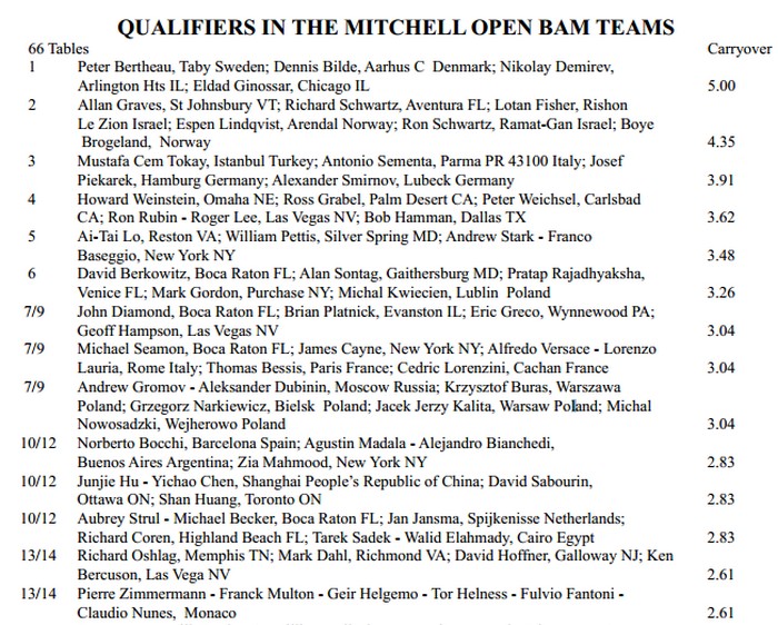 I Nationals Fall er det Michell Board-A-Match som pågår. Der er det nå 42 lag som skal kjempe om seieren. Hvis jeg har forstått rett, har lagene med seg Carryover-scoren som du ser under. Ikke så mye, men i BAM er ett poeng et helt spill. Ikke minst når lag kommer likt, er det fint å ha desimaler i Carryover.