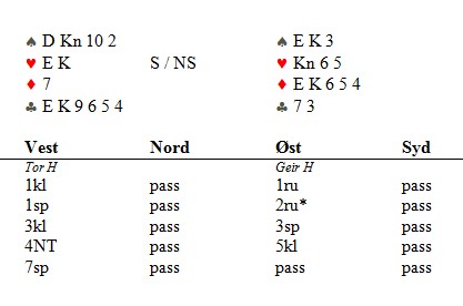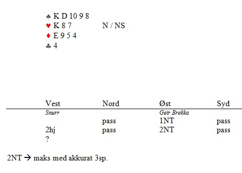 Legg merke til Geir sin tøffe 2NT.1NT er en halvpositiv melding og det er lettere å spille mot en mann. (vest)