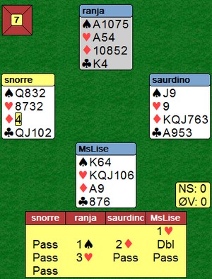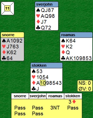 Det var bare å telle... Skrevet 04. December, 2014 av 7988 Snorre Aalberg | Tagger: spill Dette var ikke akkurat noe kunstverk, men en må telle. Jeg spilte ut singel ruter til esset. Så skulle nok spillefører gått på kløveren for å få en stjeling, men det så ubehagelig ut med ruter og ruter. Tre ganger hjerter og en liten spar fra hver hånd. Makker var inne på spar knekt og tok for ruterkongen. Når syd fulgte med ruter 9, visste jeg hele fordelingen. 3-5-2-3. Hjerteren var tett og hun kunne stjele neste ruter, ta ut trumfen, spar konge og spar til kapp for ni. I et lyst øyeblikk stjal jeg makkers ruter konge og skifta kløver. En beit. Add comment