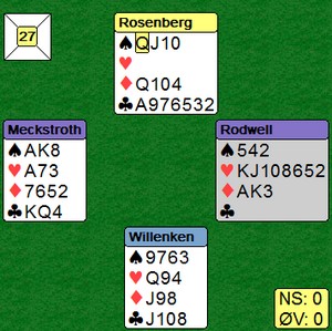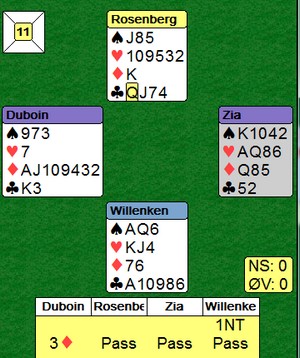 I spill 11 satt jeg nord og dro opp en hånd med to renonser og 8-5 fordeling i minor, utgang i kløver på egen hånd. S var giver og ingen i sonen. Før min tur hadde makker Helgesen åpnet med 2 spar, Romersk/Tartan som lover 5-5+, og styrke under åpning, altså ca 6-10/11 HP. Jeg så for meg 5-5+ i major, men da V meldte inn 3 hjerter tor jeg like godt til med 5 kløver. Deretter fortsatte ballet!