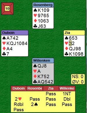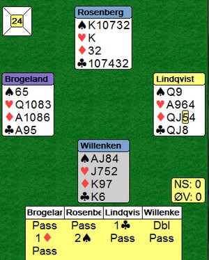 Det var Tor Olsen(V) som meldte 3 hjerter og Veronica Pettersen (Ø) doblet mitt «sluttforslag»- men det bare akselererte budserien. Helgesen likte ikke renons i trumfstøtte og introduserte 5 ruter med sin laangge 7- korts sidefarge. Tor gjenmeldte 5 hjerter men med så fin trumfstøtte i ruter måtte jeg jo være med. 6 ruter var opplagt, men ikke slutt for det. Ø meldte 6 hjerter men etter pass rundt valgte jeg å tro på undere og at 7 ruter var spillbar. Ø sin dobling av 5 kløver og makkers kontante uttak kunne indikere at Ragnar også hadde renons å by på. V doblet og hjerter ut trodde jo Helgesen skulle bete direkte, men bordet kunne jo stjele, en runde trumf rensket den fargen og det var jo ingen problem med å godspille kløverfargen. +1630 ga topp, men 6 ruter doblet med overstikk som Gunnar Saxegaard- Jan Erik Olsen fikk var også supert, +1190. Mange ØV par fikk spille billige stampekontrakter i 6 hjerter, men ved ett bord gikk faktisk 6 hjerter udoblet hjem til + 980. Flemming Johnsen- Steinar Fugleneb sto for den prestasjonen.