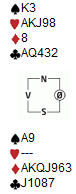 Jeg spiller sparen min, men vest har ikke mer. Øst har altså falsecardet fra E10 igjen, men det er ikke så farlig. Jeg stjeler med hjerter knekt, tar for hjerter ess og stjeler meg hjem med kløver til hjerter åtte. Vest kaster en ruter. Nå er stillingen: