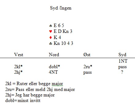 Syd meldte 2hj, selv om makker hadde tenkt svært lenge. Det er opplagt at makker ikke har en normal opplysende dobling, men på den annen side er det ikke så lett å finne ut hva han tenkte på. Mange vil mene at syd har en opplagt melding med en fin femkortfarge der makker normalt har tilpass, i tillegg to dobbeltoner i motpartens farge. I alle fall siden han hadde passet i første melderunde. Andre vil ikke tenke på å melde en gang med bare fire honnørpoeng.