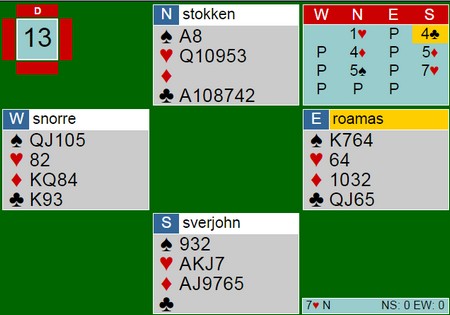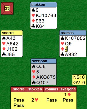 Så jeg har ikke lyst til å si om spilleren får lov til å melde eller ikke, fordi jeg vet ikke hvilket nivå spilleren er på. Sagt på en annen måte, jeg vet ikke hva spillerens likemenn ville meldt på kortene.Om du hadde spurt meg ville jeg sagt at jeg vurderer en pass, men nok melder 2 hjerter. Siden jeg vurderer en pass er dette et logisk alternativ, og du må justere til 2 ruter.