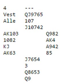 Spar til damen var det første rette, selv om knekten femte i syd ikke var så hyggelig. Så EK i kløver og kløver til spar ni. Syd stjal over og spilte mer trumf. Den vant Roald på hånda, og stjal en kløver med spar åtte. Så ruter til kongen og ut med trumfen. (husk at syd hadde korta seg ved å stjele over kløveren). Hjerter til EK og ruteresset tok de tre siste stikkene for tolv totalt. (5 + 2 + 3 + 2 = 12)