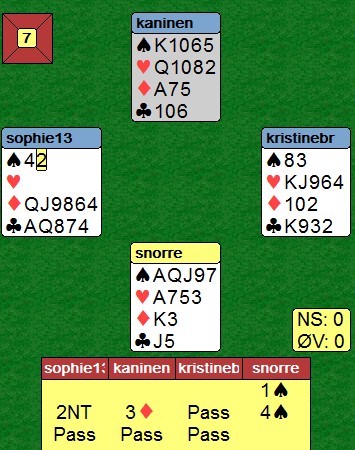 Jeg hadde fått all den info jeg trengte i dette spillet, men det er ikke ofte en først spiller inn den ene så den andre i samme spillet. Enda mer moro når det var akkurat det som skulle til for å vinne en utgang. Å melde inn for å vise fordelingshender er vel og bra, men husk at det ofte blir mange blindemenn rundt bordet. Trykk på spillet.