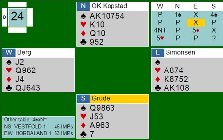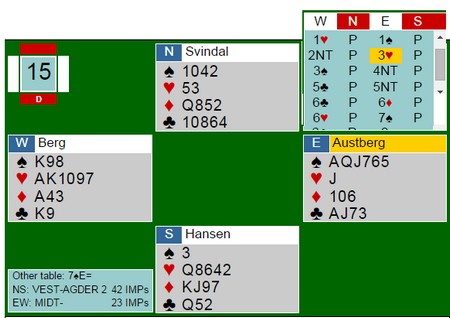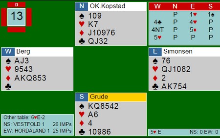 Noen spill fra 1.divisjon Skrevet 07. February, 2015 av 7988 Snorre Aalberg 5-trinnet er vanskelig. Det er vel ingen av oss som har angret på aksjoner v har gjort. Tar vi ut er det feil og melder vi er det også galt. Her var det riktig å ta ut med vest sine kort. Konsekvensen er at de gangene øst sitter på beita i 4sp, må han passe fordi makker ofte tar ut. I alle fall de gangene han har llitt fordelilng. På det andre bordet gikk det likedan helt til doblingen. Der passet vest og måtte betale ut 590. Hvem at nord/syd som skal doble 5hj, vet jeg ikke. De har ikke peiling på om ØV sleminviterer eller stamper. Fin storeslem fra Berg - Austberg 3hj viser minst fem spar og 3sp viser trekort-støtte. Så forteller vest om tre av fem ess, kløverkongen og hjerterkongen. Det var nok for øst. Kontrakten er ikke nedlegg, men når kløverdamen falt tredje gang, var det tretten lette stikk. Spiller gikk ut i kampen mellom Vest-Agder og Hornslien når Brekka - Høiland også meldte 7sp I spillet under hadde Erik Berg uflaks for en gangs skyld. Her var det mange som kom til 6hj med EK i trumf vekk. Med sparkongen ut kan ikke 5hj vinnes heller fordi øst kommer ikke inn i tide til å få kvittet seg med spartaperen etter spar konge i utspill. Litt surt å vinne bare 1 IMP når motparten er i slem på andre bordet. Her sniffa Thomas Charlsen fint i 4hj. Trykk på spillet og velg spill 17. Det meldes hardt!! 4ru viser kortfarge og da skjønner jeg på en måte at nord liker hånda si. 4hj er last train og nå mener jeg det er hardt av syd å gå på enda en gang. Never argue with success. Add comment