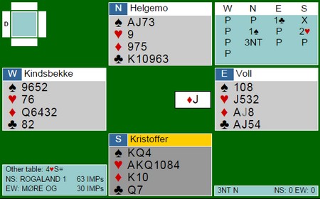 Spillet under er et spill der Boye Brogeland vurderer bedre enn Asbjørn Kindsbekken. Boye spiller ut hjerteress, mens Kindsbekken inviterer.