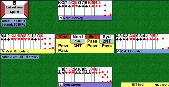 Heldigvis vinner Gillis 23 IMP på de to siste spillene. Det ene etter at irske ØV hadde to sjanser til å beite 3NT, en i utspillet og en i stikk to. Det klarte de ikke, mens Boye hadde et opplagt utspill fra KKn10xx på det andre bordet.