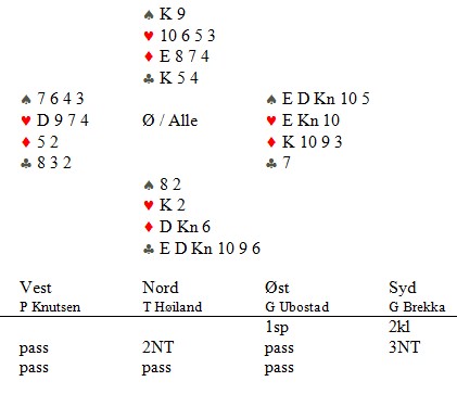 Han fikk sparess og spardame ut i 3NT. Så seks ganger kløver og øst sliter. Gaute Ubostad blanka både hjerteresset og ruter kongen, men Tom leste rett og spilte ruter til esset. Neste gang rister du litt mindre på hodet i avkast, Gaute :-)