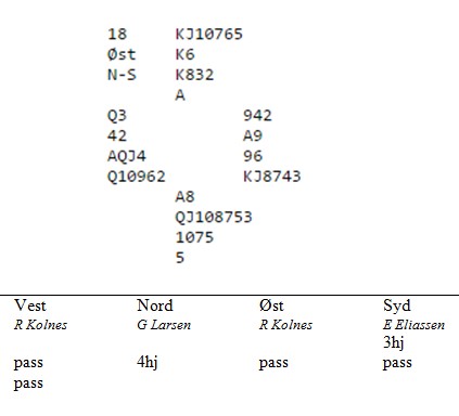 Singel ruter hos makker var kanskje ikke det beste Karl Olav kunne ønske seg, men til tross for at makker gikk ned i 4hj over 3sp, meldte han en gang til. Da hoppa Calle ut. Når ruterkongen satt tredje i kapp, var det ikke mulig å gå beit. Karl Olav stjal to ruter og kongen kom deisende på. Hjerterkongen til motparten, men +1430.
