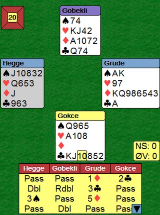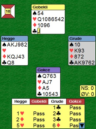 Exclusion Blackwood sier alle spillere at de kan, men i MINST 50% av tilfellene går det galt. Jeg skjønner godt at Kristoffer Hegge ville spille slem når makker hadde åpning og mange kløver. 5hj spurte etter ess, men hjerteresset teller ikke. 6kl viser to aktuelle ess, men av en eller annen grunn svarte Tor Eivind Grude 6ru. (forbehold om at BBO har tasta rett) Dette kunne vært innertier, men med singel kløver ut fikk nord en stjeling og beit. Heldigvis for Norge sto heller ikke 6kl. Tyrkia stoppa i 4sp og vant spillet.