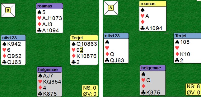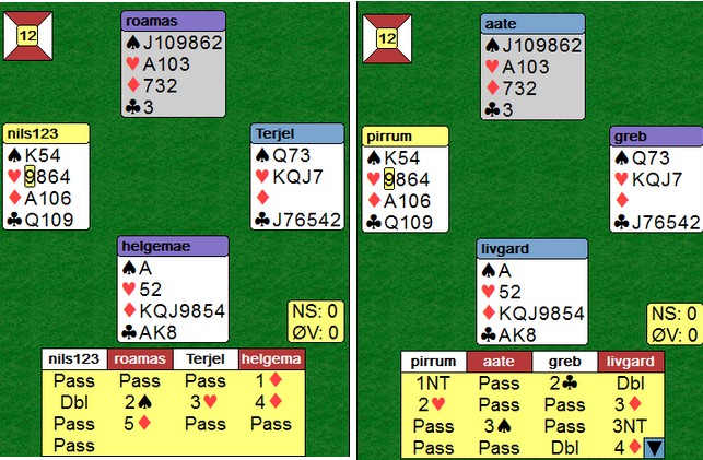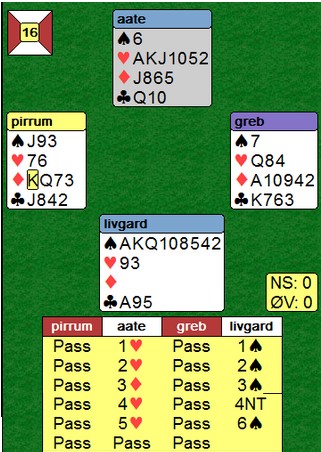 i 6hj var spillet over på et minutt. To ganger hjerter før han stjal to spar på den ene hånda og to ruter på den andre. I posisjonen under til høyre var det bare å slippe den første eller den andre kløveren og 12 stikk var hjemme uansett hvordan fargen satt. Spillet ble (selvsagt) kopiert på det andre bordet.