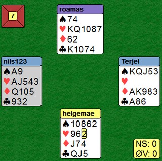 Helge Mæsel sin åpning i 4hj var mildt sagt i overkant. Jeg kjenner de som til og med ville åpnet med 2kl for å hoppe til 4hj neste gang. Han kom imidlertid sterkt tilbake. Legg merke til Roald Mæsel sin 4sp-melding. Når makker åpner med 4hj, skal den fargen være trumf og 4sp setter fokus på det svake punktet i ruter. Nå var ikke Helge til å stoppe.