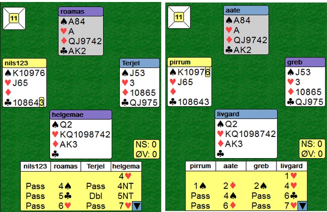 Allan legger også inn en storeslemsinvitt med 6ru og Terje Aa brukte ikke mange sekunder på å melde 7hj,