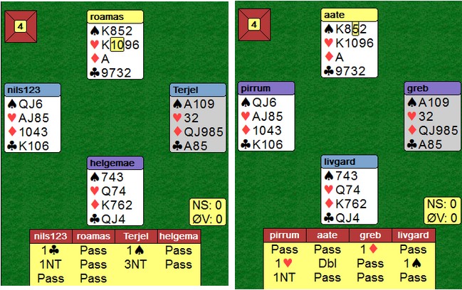Poenget er øst sin andre melding. Begge vest viser hjerter med 1ru-meldingen. Terje Lie løfter bare til 2hj, mens Jan Tore Berg hopper til 3ru for å vise singelton og hjerterstøtte. Over 2NT (minst invitt) hopper Terje Lie nok en gang forsiktig til 4hj. "Jeg har tillegg, men ikke nok til et cuebid". Odin Svendsen er naturlig nok ikke til å stoppe på det andre bordet.