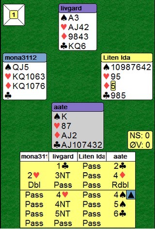 Jeg griner. Hvorfor kan dere ikke melde de fargene dere har? En og en. Nedenfra og opp. Hvis dere finner tilpass, støtter dere hverandre. Ja, jeg vet det er umoderne og bakstreversk, men det virker. Å komme til storeslem i minor er kanskje mye å forvente, men 6kl/6ru må da være mulig for topparene våre?