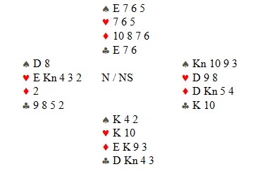 Nå skal du få ei motspillsprøve fra tirsdagen. Motparten har meldt seg opp i sparkontrakt, og makker spiller hjerter-7 ut. Bordets (vest) og din (nord) beholdning i hjerter ser slik ut: