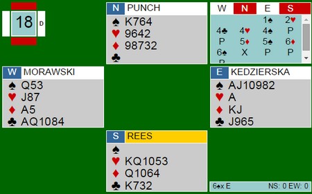 Godt meldt av Berg - Simonsen, men det ble en beit. Jeg vet ikke hva som er beste spilleplan etter EK i kløver ut, men den Erik valgte gikk i alle fall skeis. Han stjal tredje kløveren, ruter ess og ruter til stjeling. Så EK i hjerter og når Terje Lie stjal med sparkongen, ble det beit. Spar til esset etter ruterstjelingen, og så hjerter hadde gitt +620, men det er ikke sikkert det er en bedre plan.