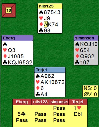Nils passer over 5kl med EK i en farge og makker har åpnet, uten at jeg helt skjønner hvorfor . Han ble reddet av gong-gongen.