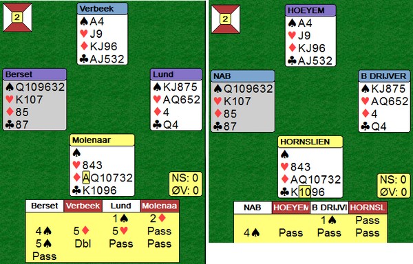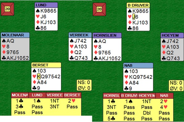 På det andre bordet spiller nederlenderen ikke så bra. Han stikker kløveren og fortsetter med spar ess og spar til stjeling. Så kløver mot bordet, men Børre bare stikker og spiller trumf til bordets ess. Kløverknekten kan Ole i syd stjele og de ti stikkene har blitt til ni.
